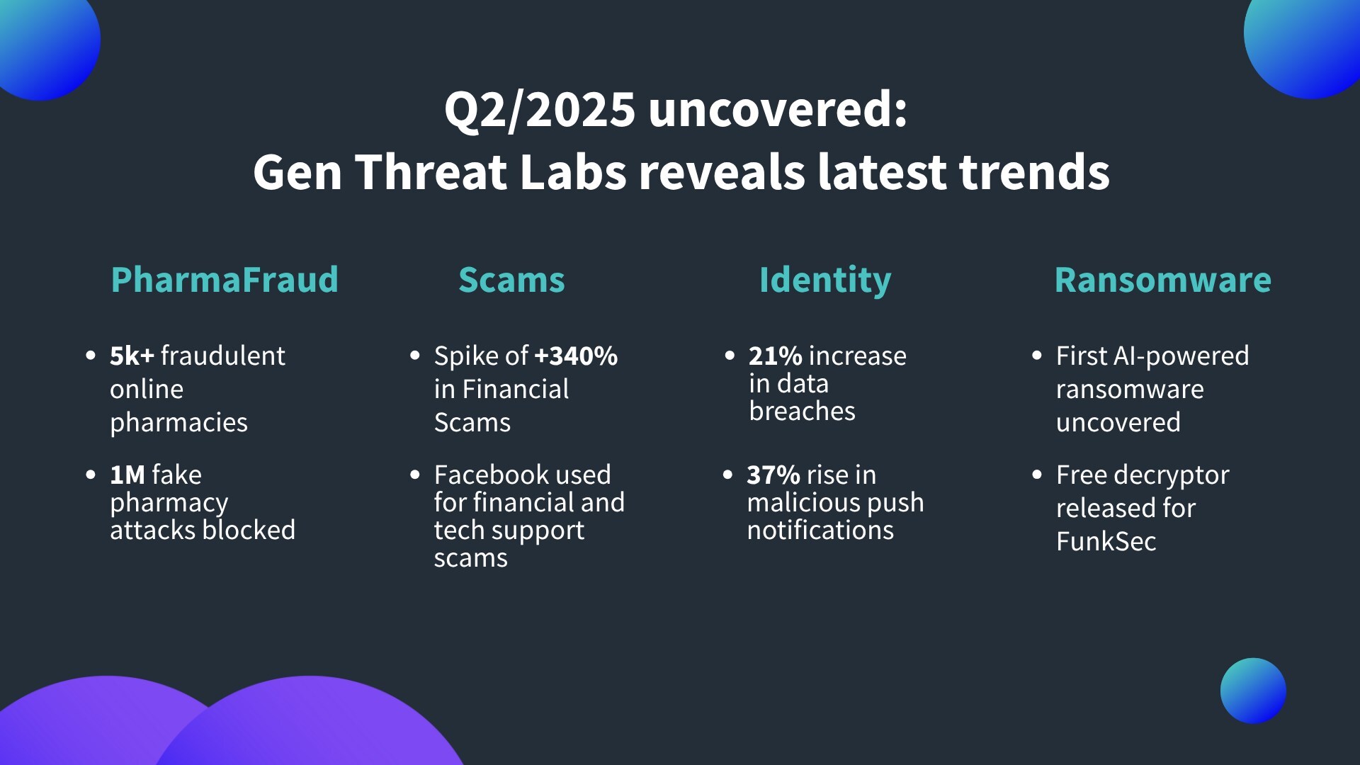 TEMPE, Ariz. and PRAGUE, July 30, 2025 /PRNewswire/ -- Gen (NASDAQ: GEN), a global leader powering Digital Freedom with a family of trusted brands including Norton, Avast, LifeLock, MoneyLion and more, today released its Q2/2025 Gen Threat Report. Gen researchers explore how AI is changing the game for cybercriminals, notably uncovering over 5,000 highly convincing fake pharmacy websites scamming people seeking high-demand prescriptions and helping take down the first known ransomware developed using AI. The team of Gen researchers also report a 21% growth in data breaches, a 340% increase in financial scams, a 100% increase in sextortion scams, and a surge in Tech Support Scams running rampant on Facebook.